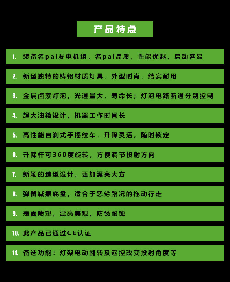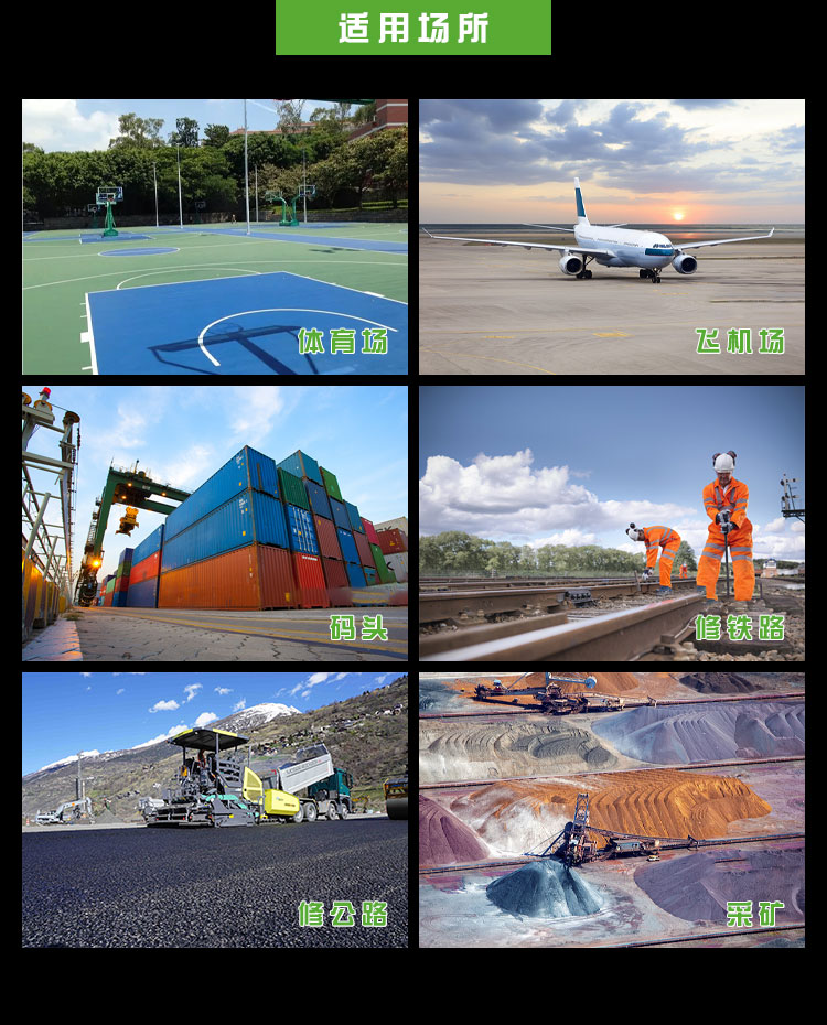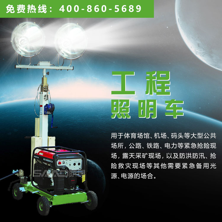 用于體育場(chǎng)館、機(jī)場(chǎng)、碼頭等大型公共場(chǎng)所,公路、鐵路、電力等緊急搶險(xiǎn)現(xiàn)場(chǎng),露天采礦現(xiàn)場(chǎng),以及防洪防汛、搶險(xiǎn)救災(zāi)現(xiàn)場(chǎng)等其他需要緊急備用光源、電源的場(chǎng)合。