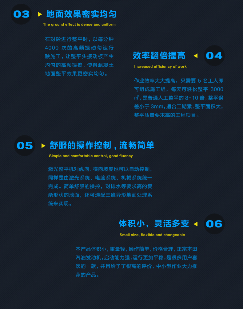 2.精密激光整平機的整平原理是,依靠液力驅(qū)動的整平頭,配合激光系統(tǒng)和電腦控制系統(tǒng)在自動找平的同時完成整平工作。整平頭上配備有一體化設(shè)計的刮板、振動器和整平板,將所有找平、整平、振搗壓實工作集于一身,并一次性完成。電腦控制系統(tǒng)每秒10次實時自動調(diào)整標(biāo)高,均衡設(shè)計的振動器振動頻率達4000次/分鐘。