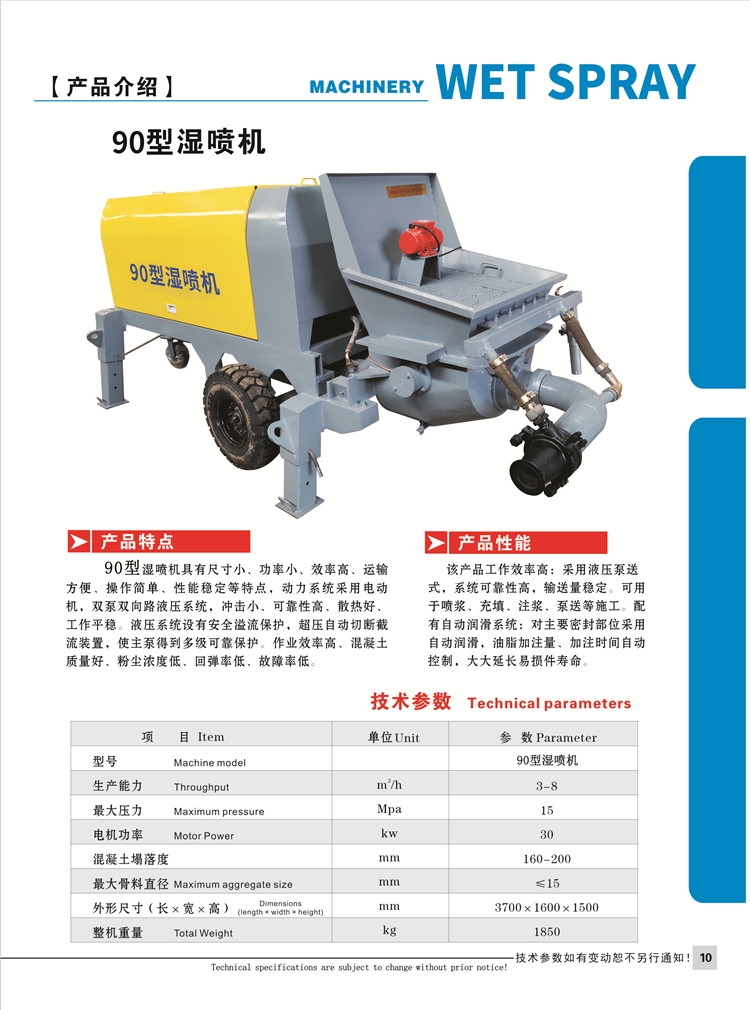 這款混凝土濕噴機主要用于混凝土的噴濕,可用于噴漿、充填、注漿、泵送等工程施工。能使混合料拌合均勻,水灰比準確控制,有利于水泥的水化,因而粉塵小,回彈小、混凝土均質(zhì)性好,強度高。結(jié)構(gòu)合理、性能穩(wěn)定、操作維護方便、使用壽命長,應(yīng)用于鐵(公)路,地鐵,高層建筑,護坡(基坑)加固,水電工程,地下工程及礦山井巷噴射混凝土施工作業(yè)。