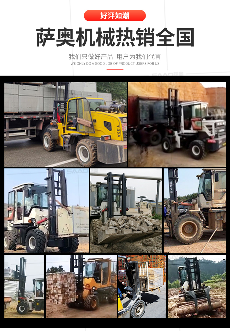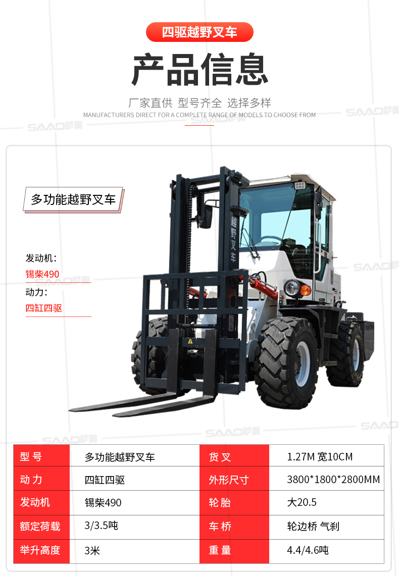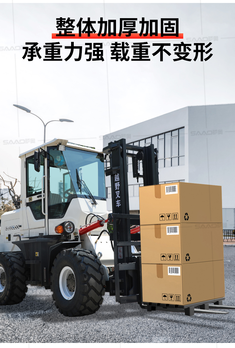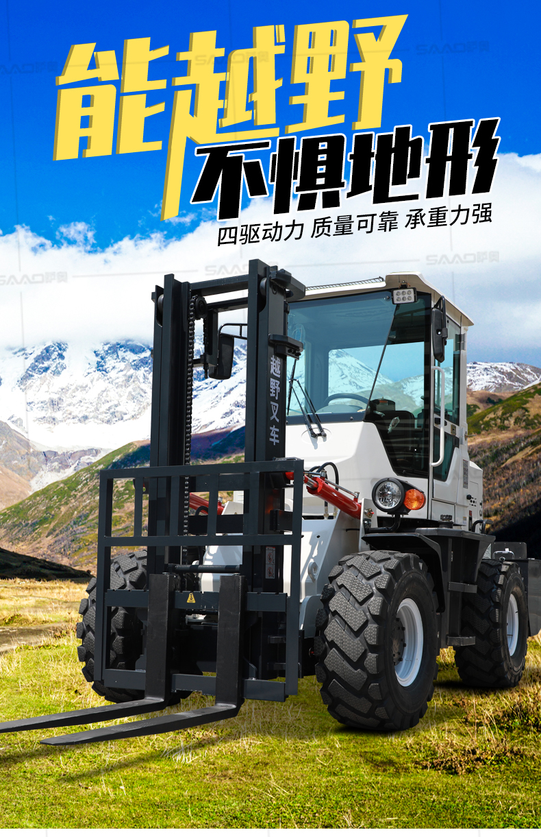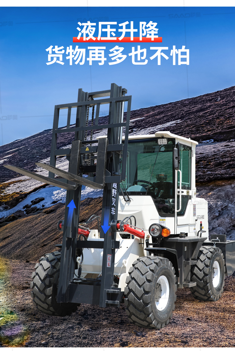 產品介紹: 多功能四驅越野叉車又叫野戰叉車,它具有良好的機動性、越野性可靠性。是一種可以在坡地和不平地面上安全高地進行貨物裝、卸、堆垛及搬運作業的工程車輛平衡叉車一