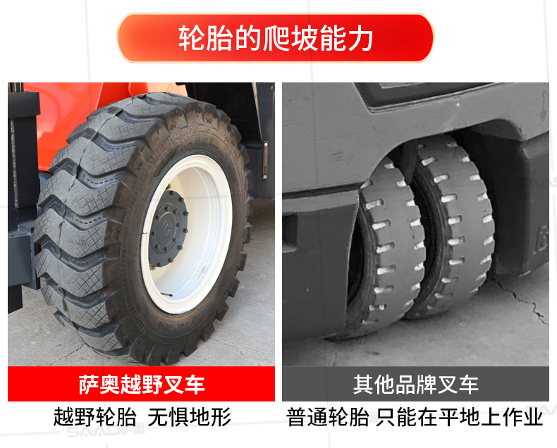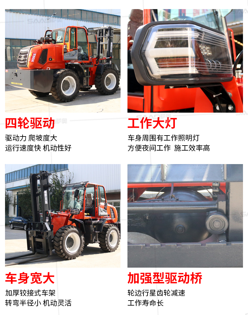 越野叉車可以在坡地和不平地面上進行貨物裝、卸、堆垛及搬運作業,具有良好的機動性、越野性可靠性。其功能多樣,可搭配側移器、調距叉、旋轉器、軟包夾、推出器、側翻叉、側
