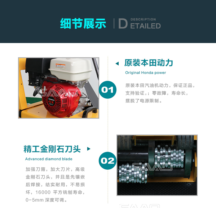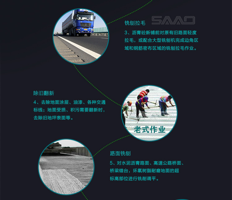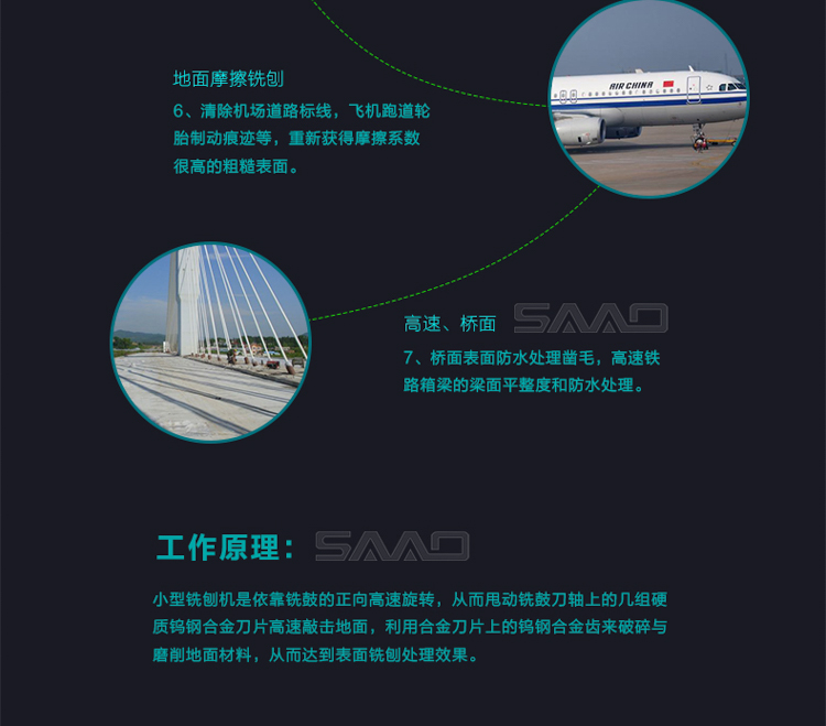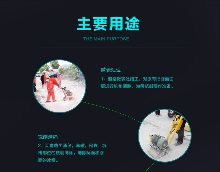 用于橋面鋪設瀝青或車間舊的混凝土地面重新攤鋪混凝土之前,清除水泥浮漿以及鏟平拉毛,也用于清除建筑施工中遺留的堅硬灰渣。