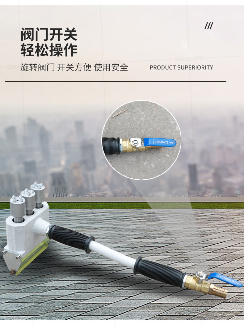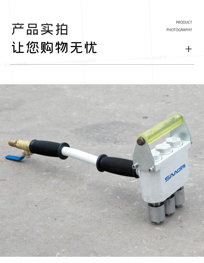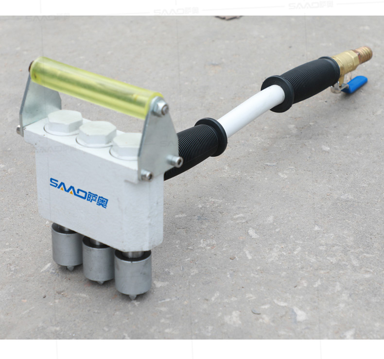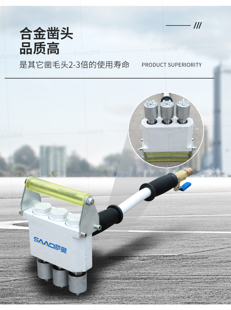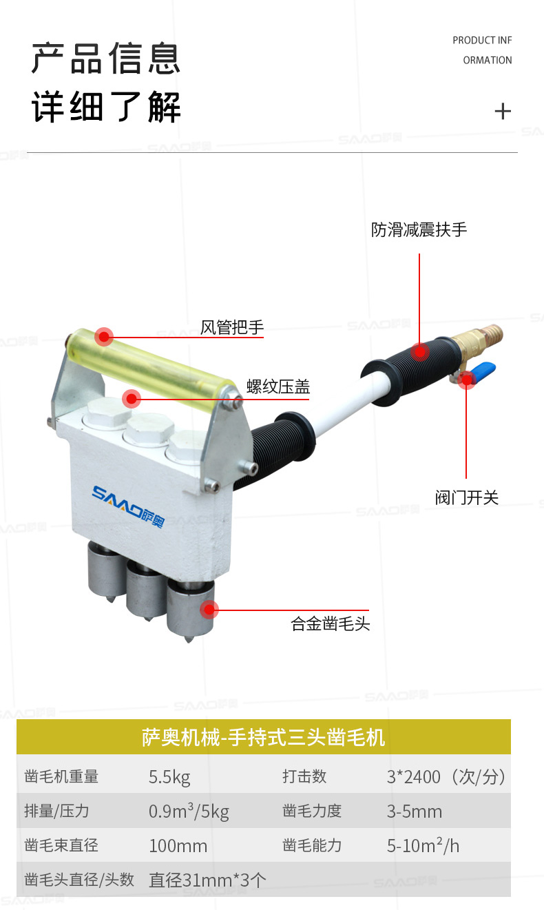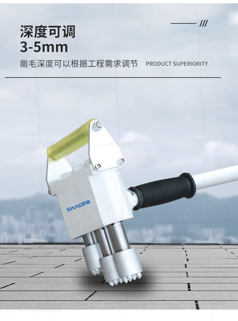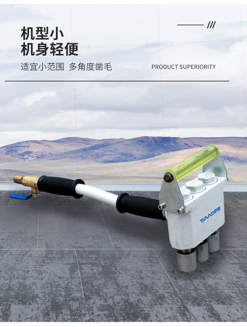 手持式三頭鑿毛機(jī)技術(shù)參數(shù): 鑿毛機(jī)重量:5.5kg 打擊數(shù):3*2400(次/分) 排量/壓力:0.9m/5kg 鑿毛深度:3-5mm 鑿毛束直徑:100mm 鑿毛能力:5-10m/h 鑿毛頭直徑/頭數(shù):直徑31*3 手持式三頭鑿