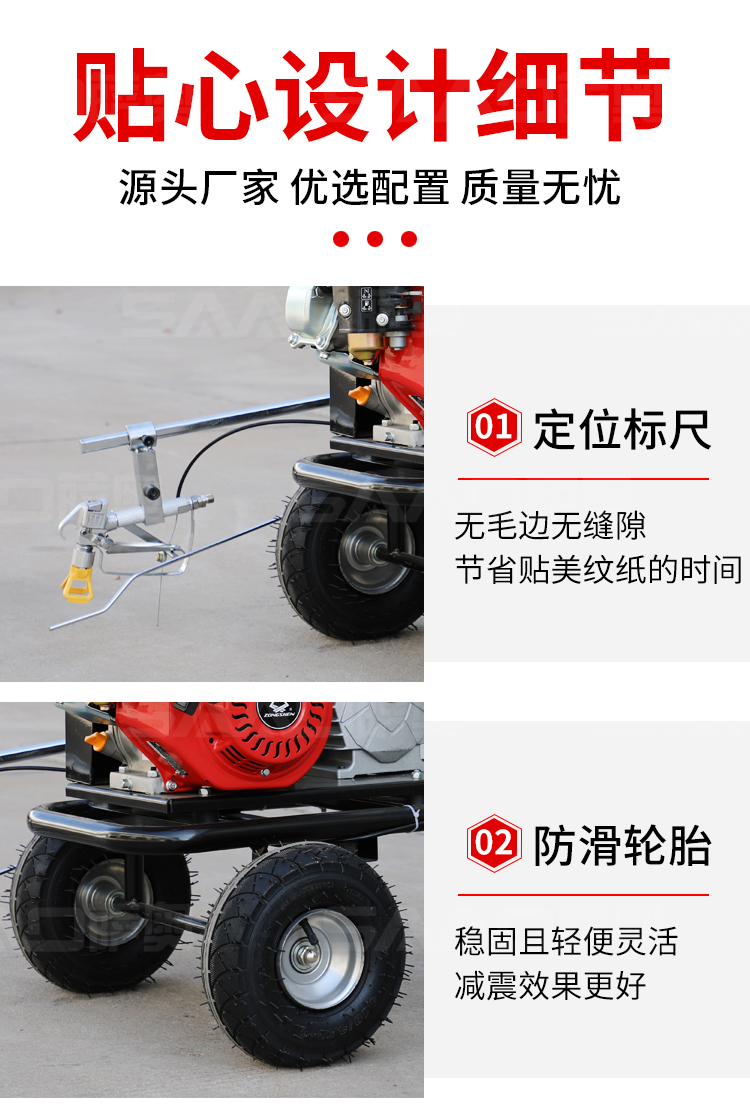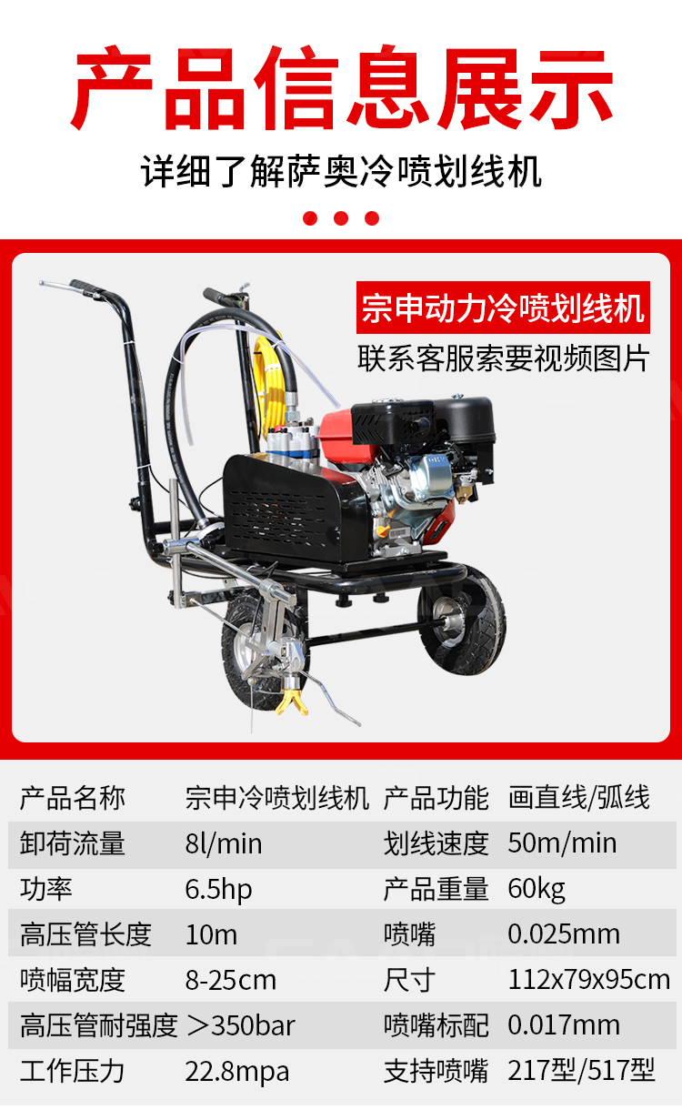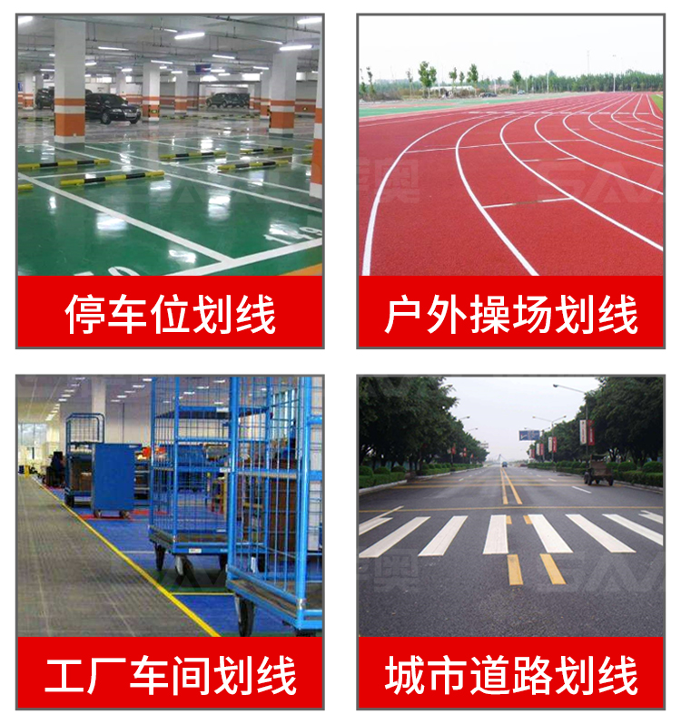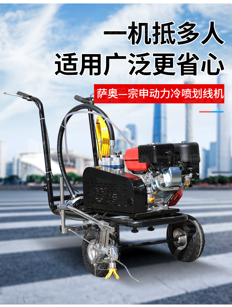 冷噴劃線機是常溫標線施工的專用設備,噴出的線型清晰、流暢、飽滿、均勻,主要用于公路、停車場、機場、加油站、公司廠區等涂畫直線、虛線、曲線、斑馬線、文字、箭頭、圖形