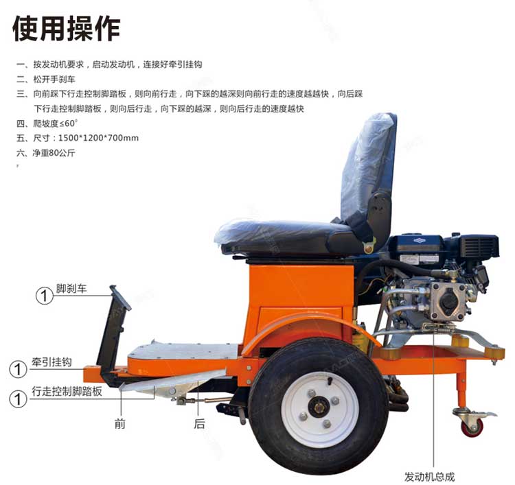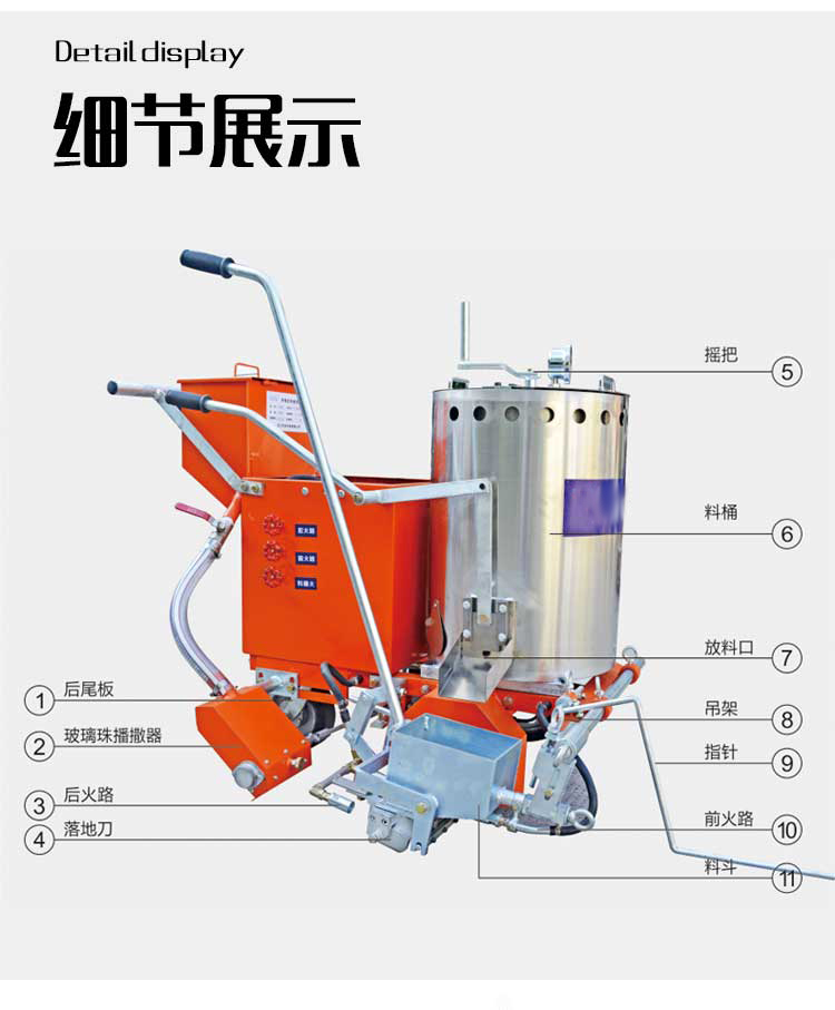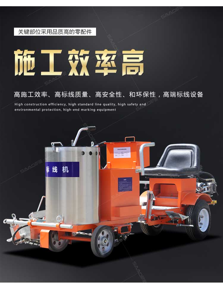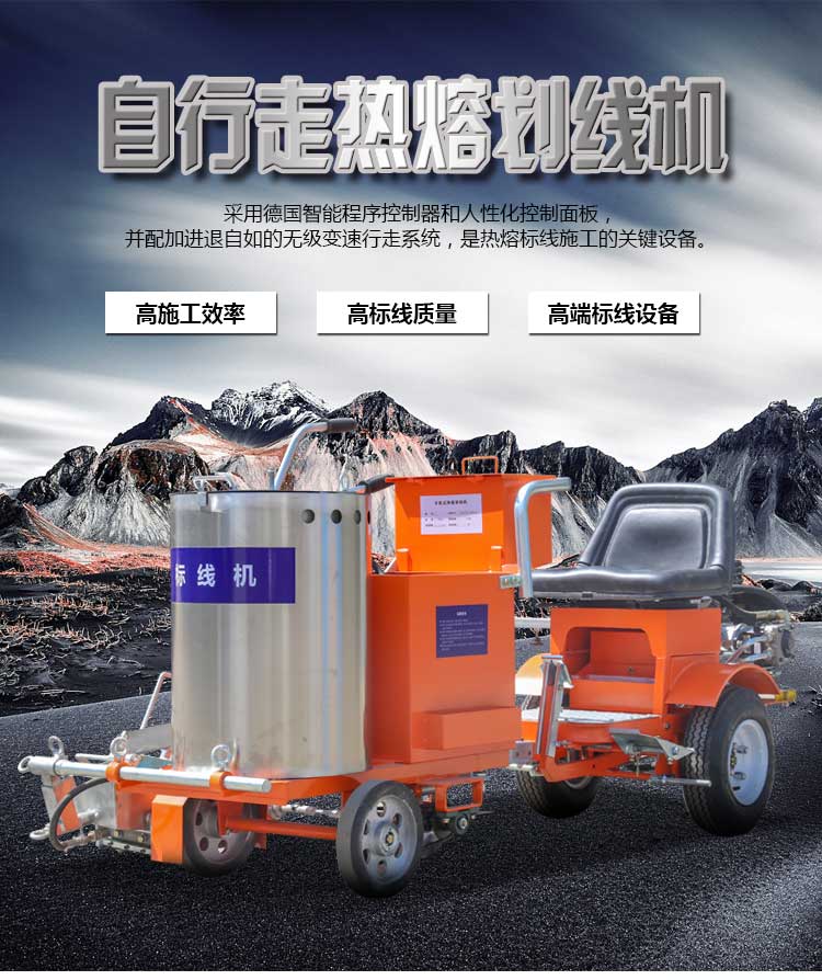 產品介紹: 自走式熱熔劃線機,一種廣泛應用于道路、高整公路、停車場、廣場和跑道的在平整的地面上劃出不同約束、指引和警示等規則限制標志的路面施工機械。劃線機以其快速、