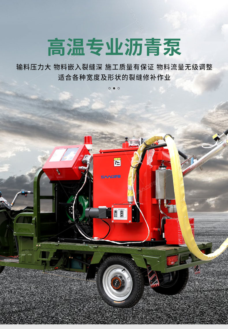 汽油灌縫機(jī)主要有手推式和自行式手持灌縫管操作,采用進(jìn)口柴油燃燒器加熱。在工作時(shí)首先在料箱內(nèi)加入瀝青或灌縫膠,啟動(dòng)發(fā)電機(jī)供電,依次間斷打開(kāi)導(dǎo)熱油泵開(kāi)關(guān),燃燒器開(kāi)關(guān),出料管加熱開(kāi)關(guān);調(diào)整自動(dòng)溫控系統(tǒng)與材料的溫度相同,通過(guò)柴油燃燒器自動(dòng)加熱熔料箱內(nèi)導(dǎo)熱油開(kāi)始升溫(拖式為強(qiáng)制循環(huán))使材料融化,溫度是通過(guò)自控系統(tǒng)來(lái)控制。溶料時(shí)間大約30-40分鐘左右。在材料融化、出料管溫度達(dá)到后可以進(jìn)行工作。手持灌縫管對(duì)正裂縫灌縫處理。瀝青泵的出料流量可調(diào)。在工作過(guò)程中隨時(shí)添加材料保證工作的連續(xù)性。