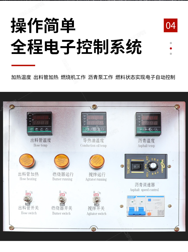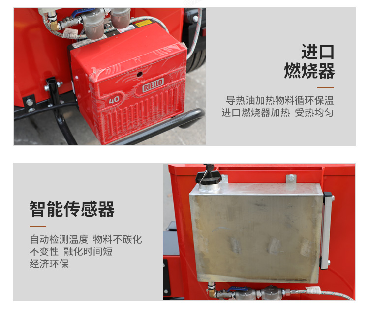 灌縫機(jī)主要有手推式和自行式手持灌縫管操作,采用進(jìn)口柴油燃燒器加熱。在工作時(shí)首先在料箱內(nèi)加入瀝青或灌縫膠,啟動(dòng)發(fā)電機(jī)供電,依次間斷打開導(dǎo)熱油泵開關(guān),燃燒器開關(guān),出料