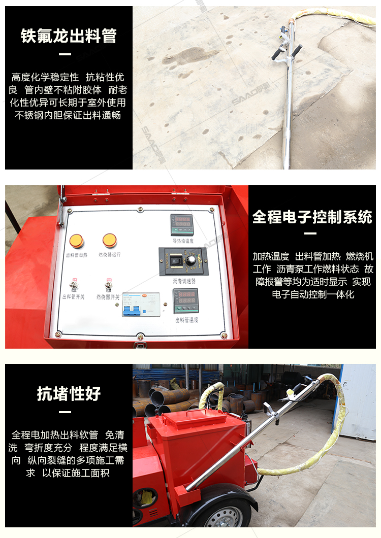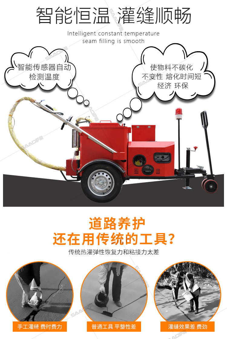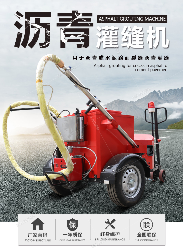 灌縫機主要有手推式和自行式手持灌縫管操作,采用進口柴油燃燒器加熱。在工作時首先在料箱內加入瀝青或灌縫膠,啟動發電機供電,依次間斷打開導熱油泵開關,燃燒器開關,出料