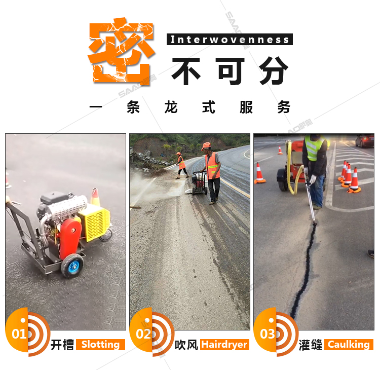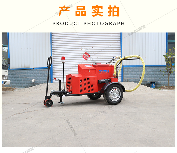 灌縫機主要有手推式和自行式手持灌縫管操作,采用進口柴油燃燒器加熱。在工作時首先在料箱內加入瀝青或灌縫膠,啟動發電機供電,依次間斷打開導熱油泵開關,燃燒器開關,出料管加熱開關;調整自動溫控系統與材料的溫度相同,通過柴油燃燒器自動加熱熔料箱內導熱油開始升溫(拖式為強制循環)使材料融化,溫度是通過自控系統來控制。溶料時間大約30-40分鐘左右。在材料融化、出料管溫度達到后可以進行工作。手持灌縫管對正裂縫灌縫處理。瀝青泵的出料流量可調。在工作過程中隨時添加材料保證工作的連續性。