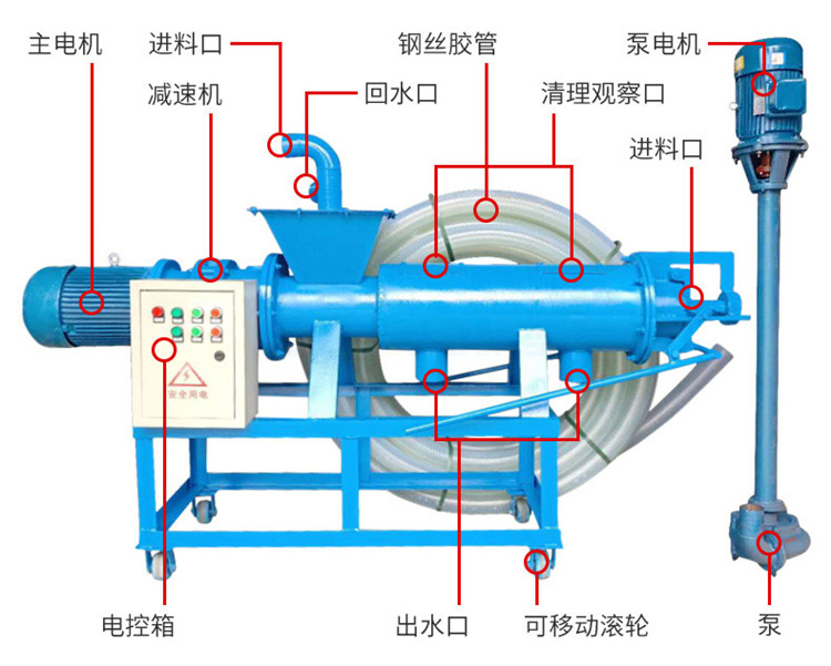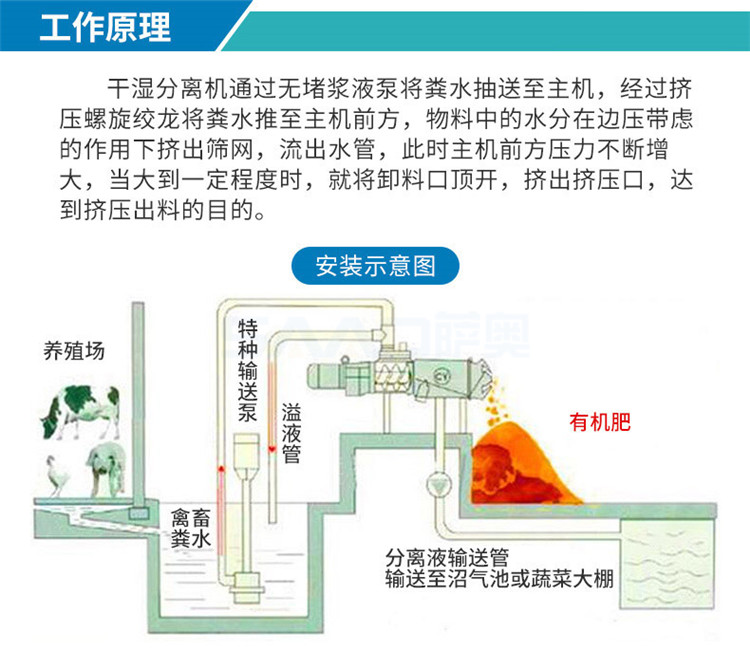 禽畜類糞便處理機能將雞糞、牛糞、豬糞等禽畜糞便原糞水分離為液態有機肥和固態有機肥。液態有機肥可直接用于農作物利用吸收,固態有機肥可運到缺肥地區使用,也可起到改善土壤結構的作用,同時經過發酵可制成有機復合肥。用泥漿泵將原糞水送至機內,通過安置在篩網中的螺旋軸,擠壓分離出固態物質,液體則通過篩網從出液口流出。
