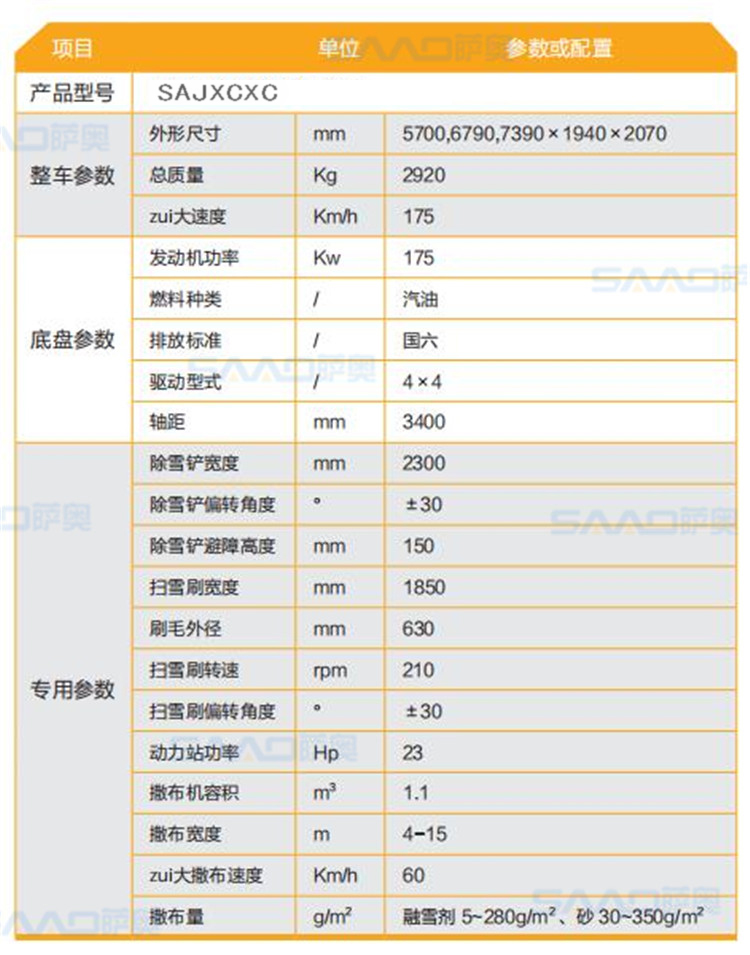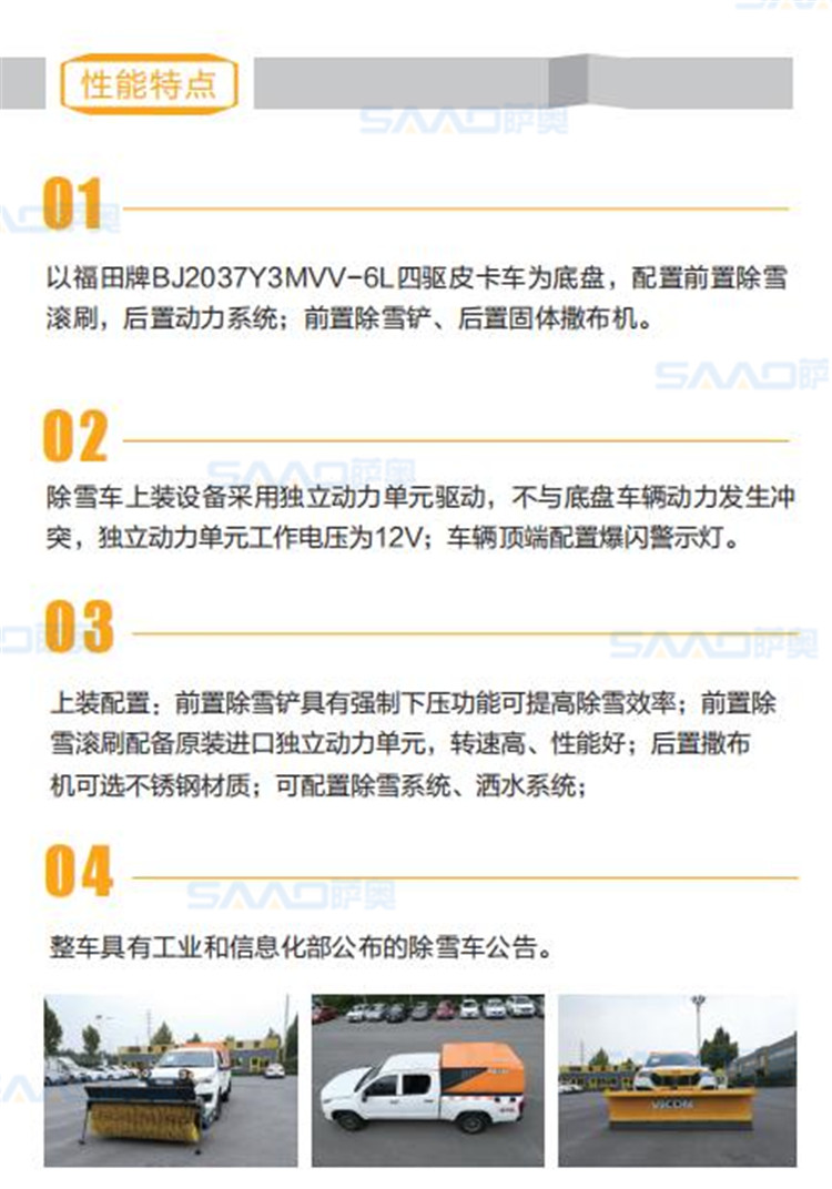 用途以皮卡車為底盤車配備前置除雪鏟、后置液體撒布機,專用于機場跑道等區域除雪融雪作業,也可換裝掃雪滾刷進行掃雪作業。